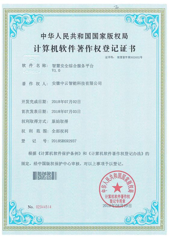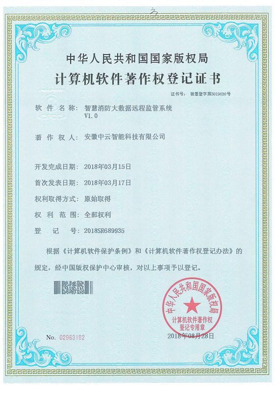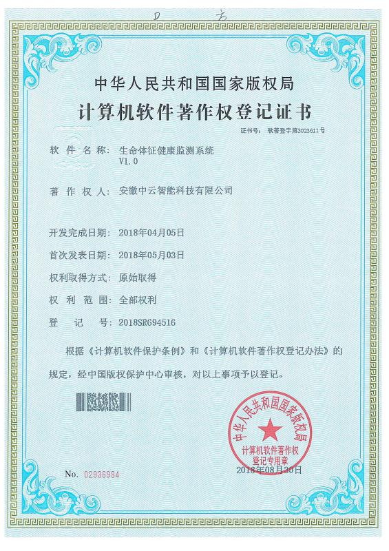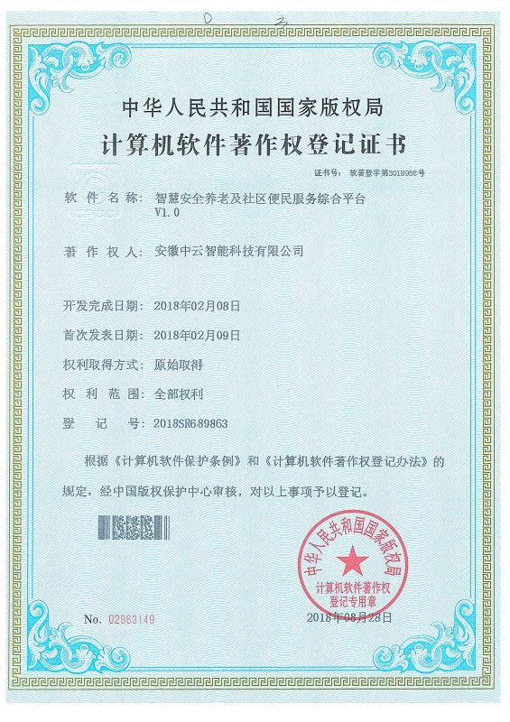 8月底,本司“生命體征健康監(jiān)測(智能床墊)系統(tǒng)”、“智慧安全養(yǎng)老及社區(qū)便民服務(wù)綜合平臺(tái)”、“智慧消防大數(shù)據(jù)遠(yuǎn)程監(jiān)管系統(tǒng)”、“智慧安全綜合服務(wù)平臺(tái)”、“智慧黨建系統(tǒng)”等五個(gè)項(xiàng)目,先后通過了中國版權(quán)局保護(hù)中心的審核,取得了《中華人民共和國國家版權(quán)局計(jì)算軟件著作權(quán)登記證書》。