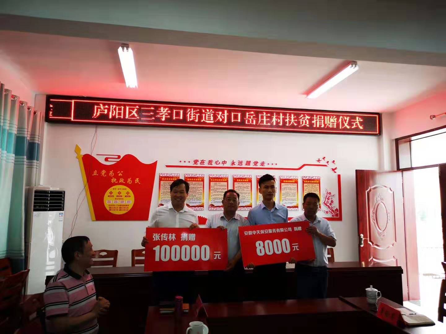 2019年7月4日,安徽中云智能科技董事長張傳林等企業(yè)家在合肥市三孝口街道黨工委唐永龍書記的帶領(lǐng)下,參加了合肥市三孝口對(duì)臨泉縣滑集鎮(zhèn)岳莊村扶貧的捐贈(zèng)儀式,滑集鎮(zhèn)鎮(zhèn)長魏淼同志出席了此次的捐贈(zèng)儀式。