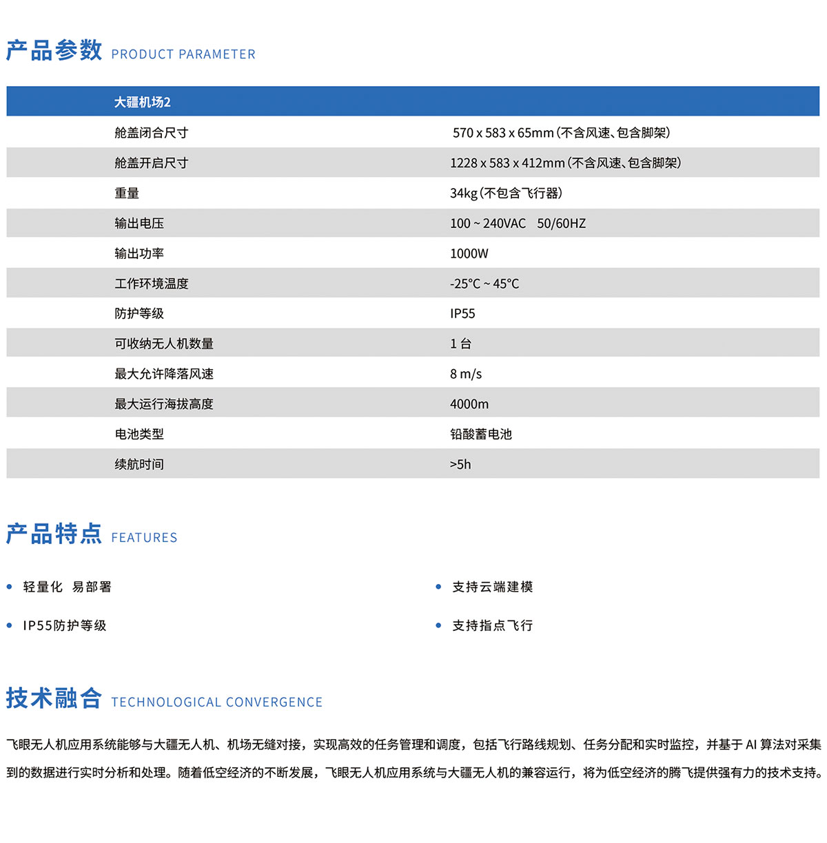 更小身形,更勝重任。高性能小型無人值守平臺大疆機場2配備專有 Matrice 3D/3TD 無人機,不僅輕量化、易部署,且具備更強大的作業能力和云端智能功能,大幅降低無人值守作業門檻,加上飛眼無人機管理平臺的深度融合管理,作業效率和質量更上新高度。