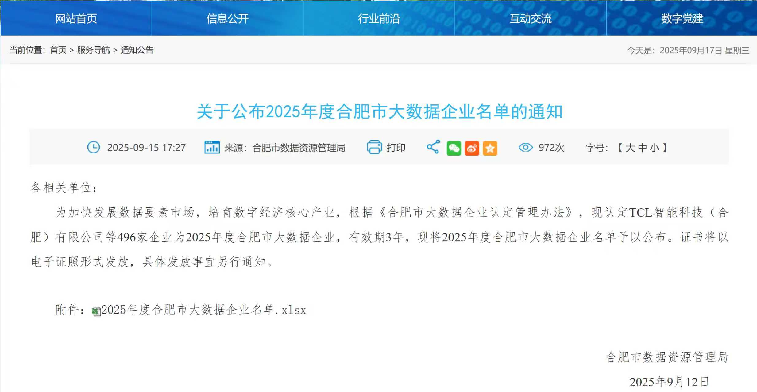 此次成功入選2025年度合肥市大數(shù)據(jù)企業(yè)名單,既是對公司在數(shù)據(jù)要素價值挖掘、技術創(chuàng)新實力及行業(yè)場景落地能力的高度肯定,也標志著企業(yè)正式納入合肥市數(shù)字經濟核心產業(yè)培育體系。